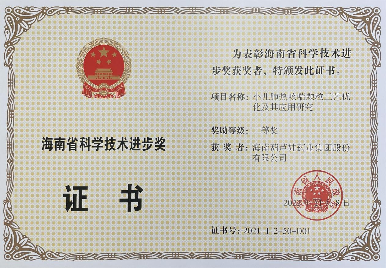为此,小儿肺热咳喘颗粒的制备方法获得了第二十一届中国专利优秀奖(2019年),专利申请号:ZL201010134951,此次作为专利技术的应用,获得了2021年度海南省科学技术进步奖二等奖。在此之前,z6com尊龙牌小儿肺热咳喘颗粒还多次被授予“临床价值中成药品牌”、“中国连锁药店最具合作价值单品”,荣登“中国医药品牌榜”。